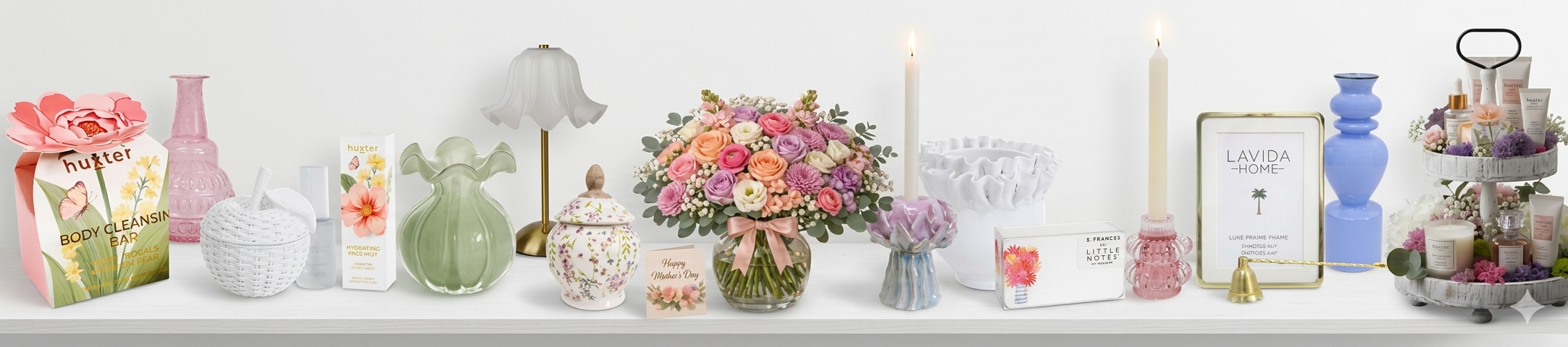 A thoughtfully curated Mother’s Day bundle featuring a selection of Huxter essentials — a lip balm, body cleansing bar, hydrating face mist and hand balm — paired with soft candlelight and gentle floral styling. Each bundle is wrapped in a calm, feminine palette designed to feel considered, comforting and beautifully gift‑ready.